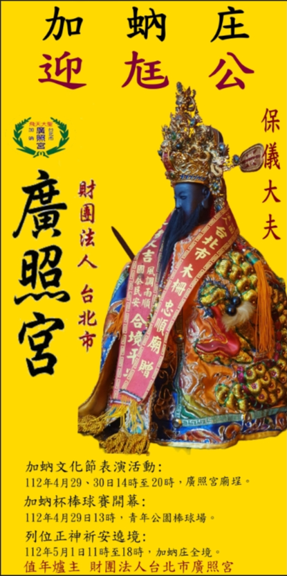 6:00 廣照宮協同往[大稻埕霞海城隍廟]、[大稻埕慈 聖宮] 、[大龍峒保安宮] 、[關渡宮]、[木柵忠 順廟] 恭請列位神尊蒞宮作客。